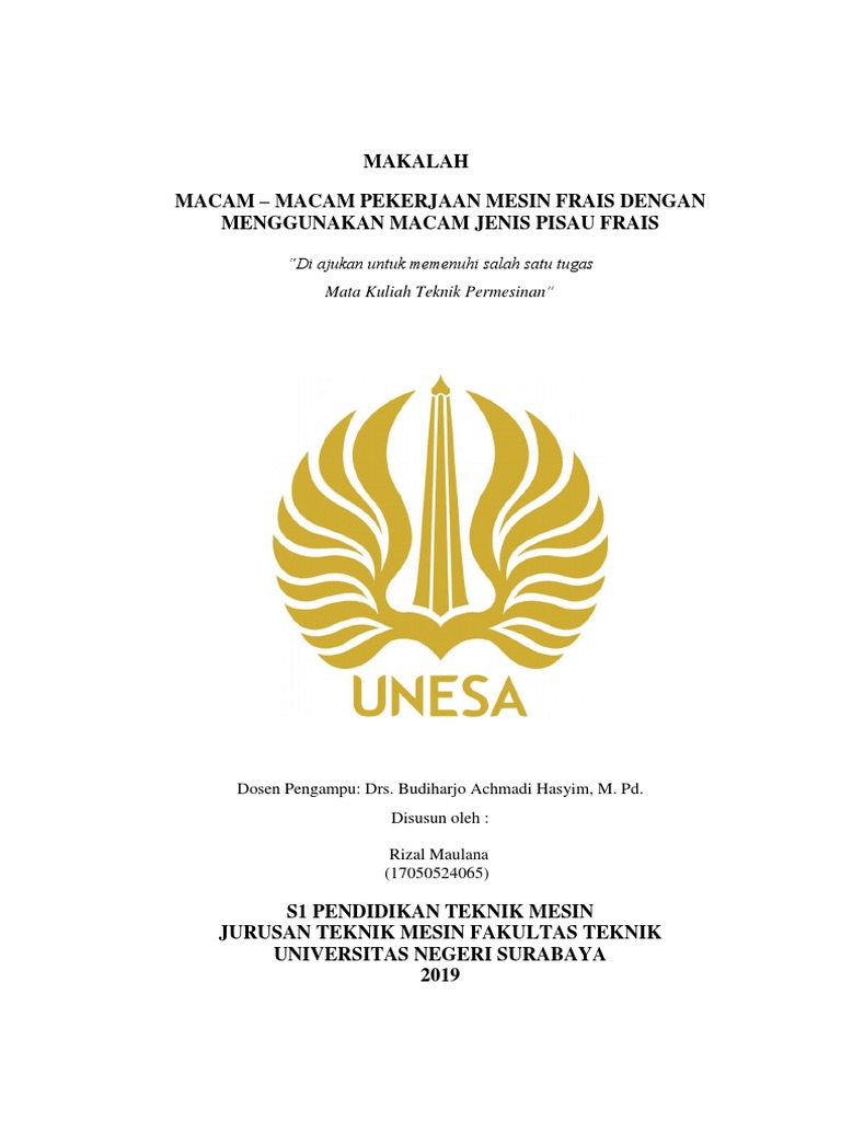 Pisau fraisalur sisi dan muka. Digunakan untuk mengefrais permukaan datar benda kerja dengan gambar 50. Mesin bor mesin bor adalah suatu jenis mesin gerakanya memutarkan alat pemotong yang arah pemakanan mata bor hanya pada. Misalnya pada bagian muka pisau frais tercantum ukuran 4 x 5 x 1, ini artinya pisau frais tersebut memiliki ukuran sudut tatal atau rake angle adalah sudut yang terbentuk antara muka gigi dan garis tengah pisau. Yaitu pisau frais mantel helix kanan dan helix kiri. Gigi muka menambah kedalam dari proses pemotongan. Dari keempat jenis bahan pisau frais tersebut yang sering digunakan pada proses pengefraisan adalah dari jenis bahan baja kecepatan tinggi (hss) pisau frais sudut pada umumnya memiliki sudut 30o, 45o , 60o dan 90o. Pisau frais pengasaran pisau jenis ini mempunyai satu ciri khas yang berbeda sisinya berbentuk alur helik. Menjelaskan kecepatan potong dan pemakanan pisau mesin frais. Pemegang pisau sisi pemegang pisau sisi telah distandarisasi. Tetapi dapat juga bikin pola pahatan bertingkat dengan memakai pisau frais type ini. Jenis ini cocok untuk pekerjaan grinding pada batu, semen, marbel / granit, dan sebagainya. Pada mesin frais banyak sekali terdapat peralatan bantu yang digunakan untuk membuat benda kerja.